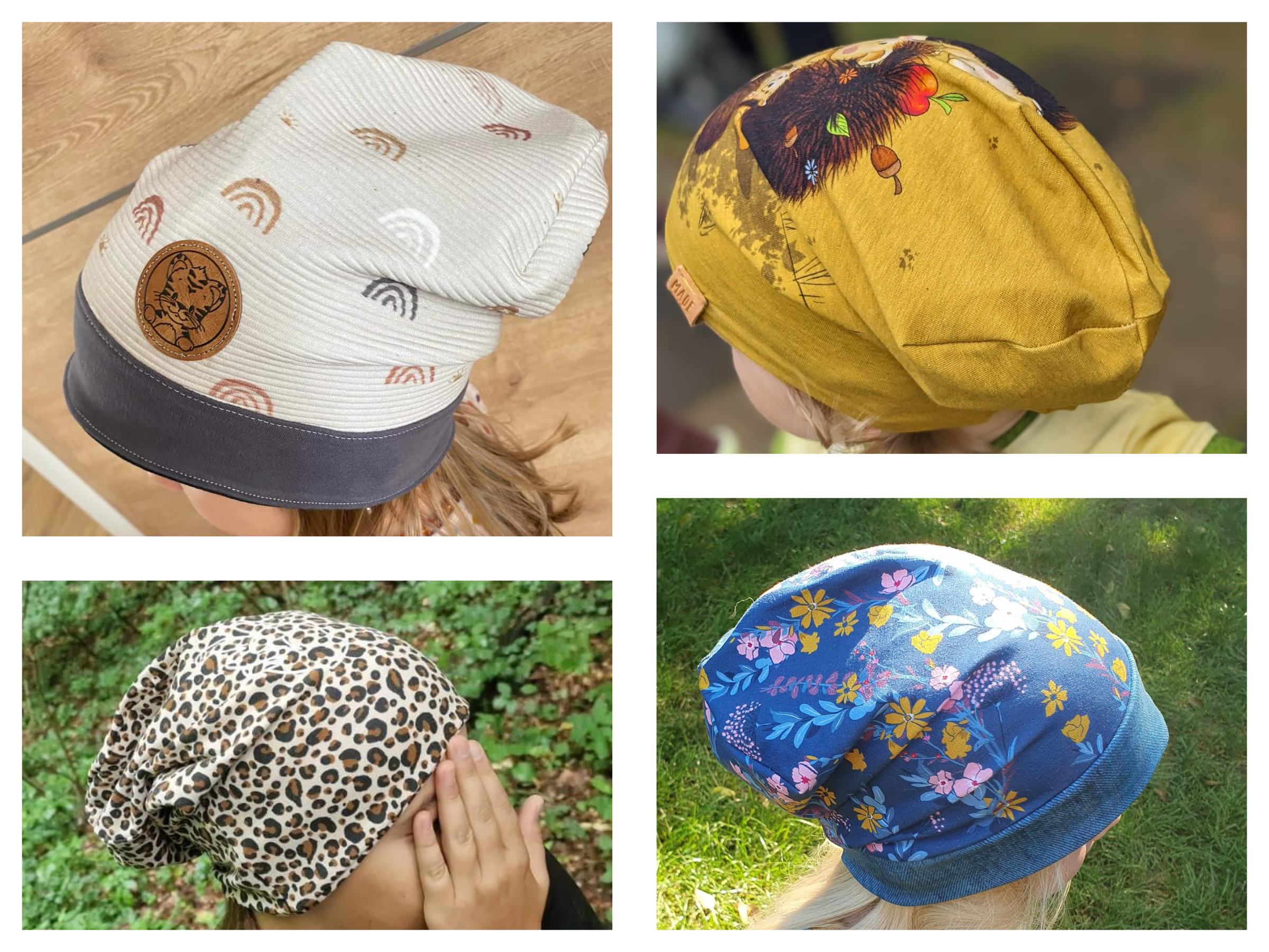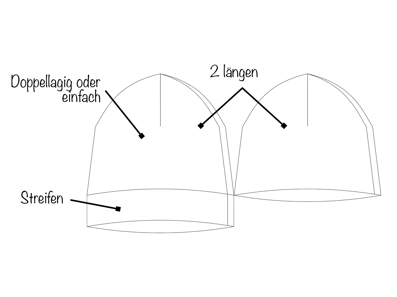 Im Schnittmuster sind Varianten mit langer Beanie, kurzer Beanie, doppellagig, einfach, mit und ohne Streifen enthalten.
