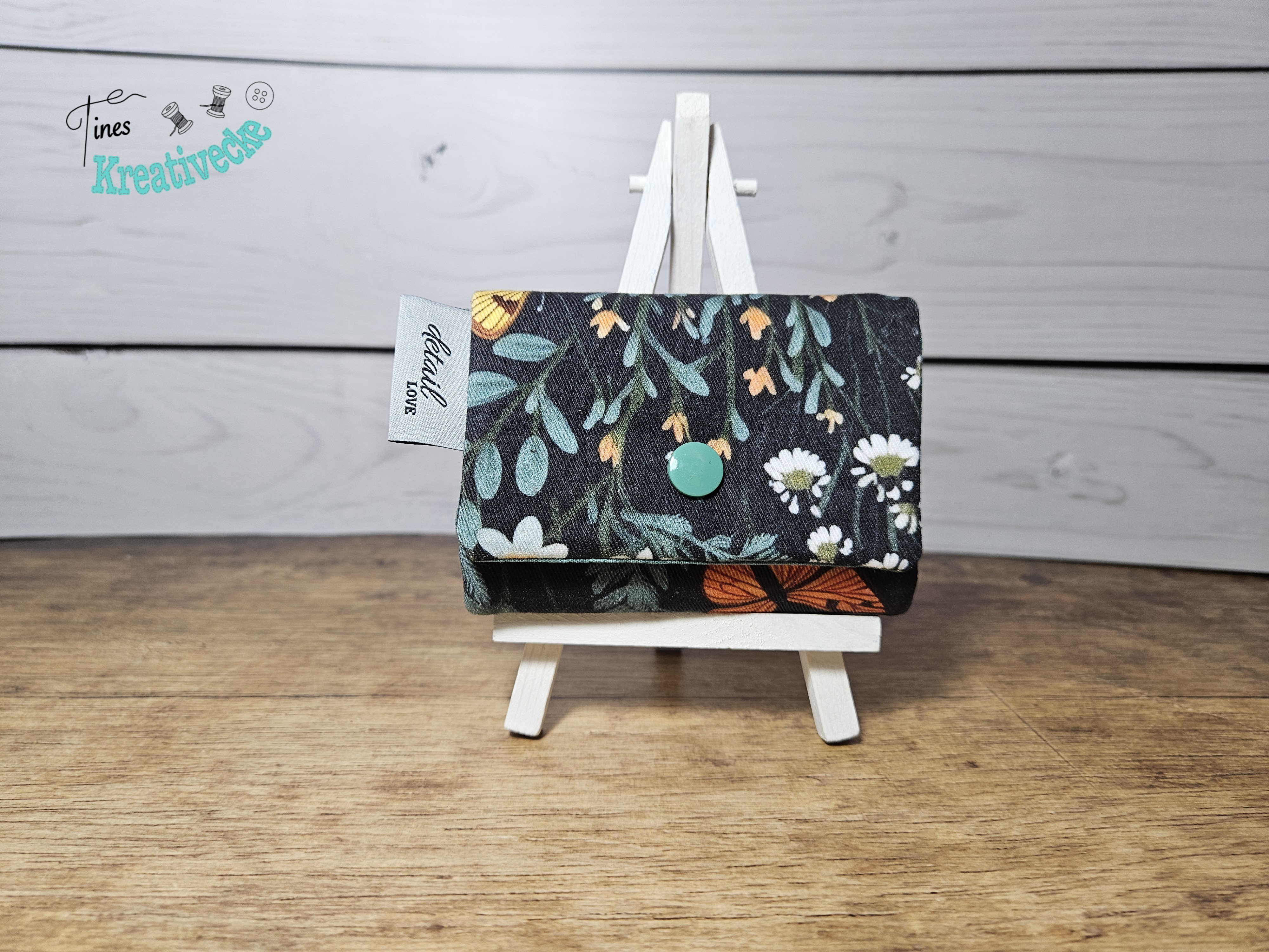 Die kleine Geldbörse mit Schmetterling Blumenprint verfügt über 4 Kartensteckfächer und 1 Reißverschlussfach.