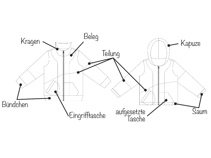 Zum Schnittmuster gehören eine Varinate mit Kragen oder Kapuze, mit Bündchen oder Saum, eine aufgesetzte Tasche oder Eingrifftaschen.