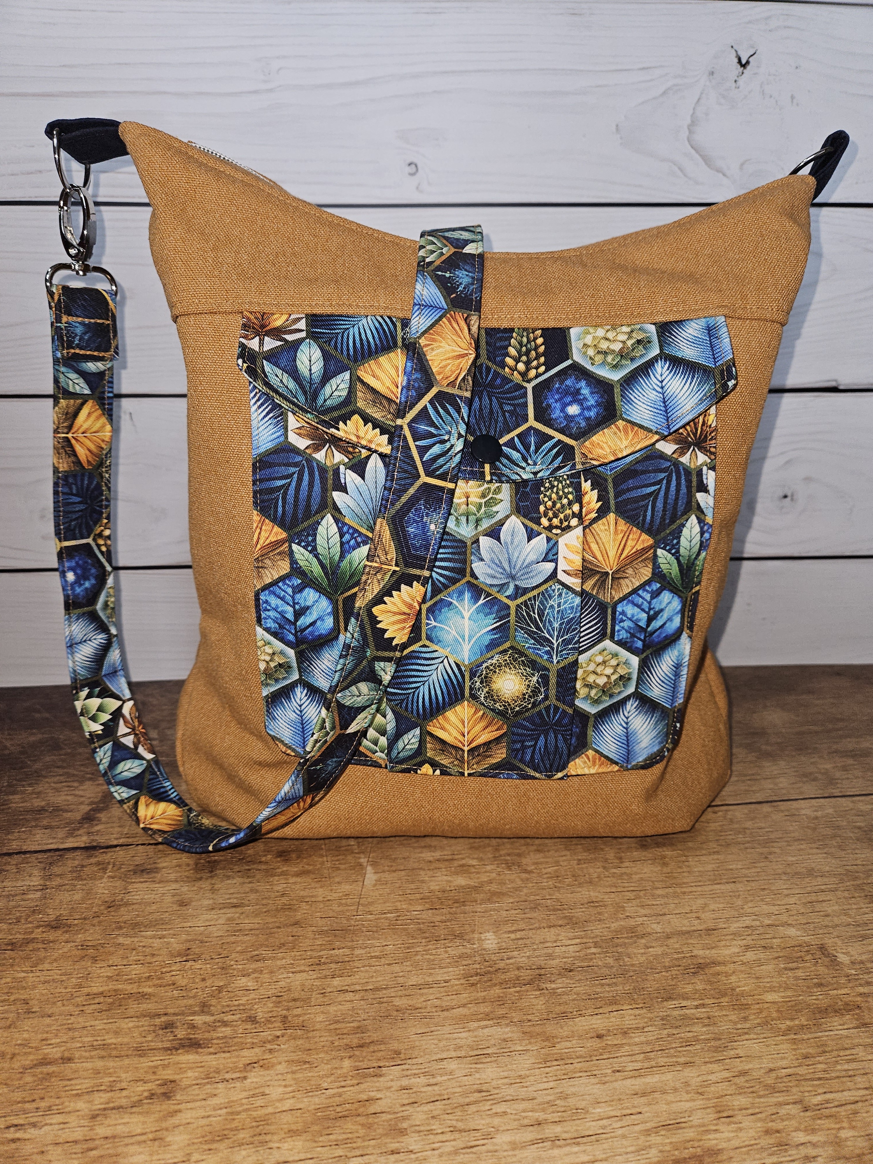 Diese geräumige Umhängetasche wird mit einem Reißverschluss verschlossen. Außen befindet sich eine aufgesetzte Tasche die mit einem Druckknopf verschlossen wird. Innen befindet sich eine kleine Reißverschlusstasche.